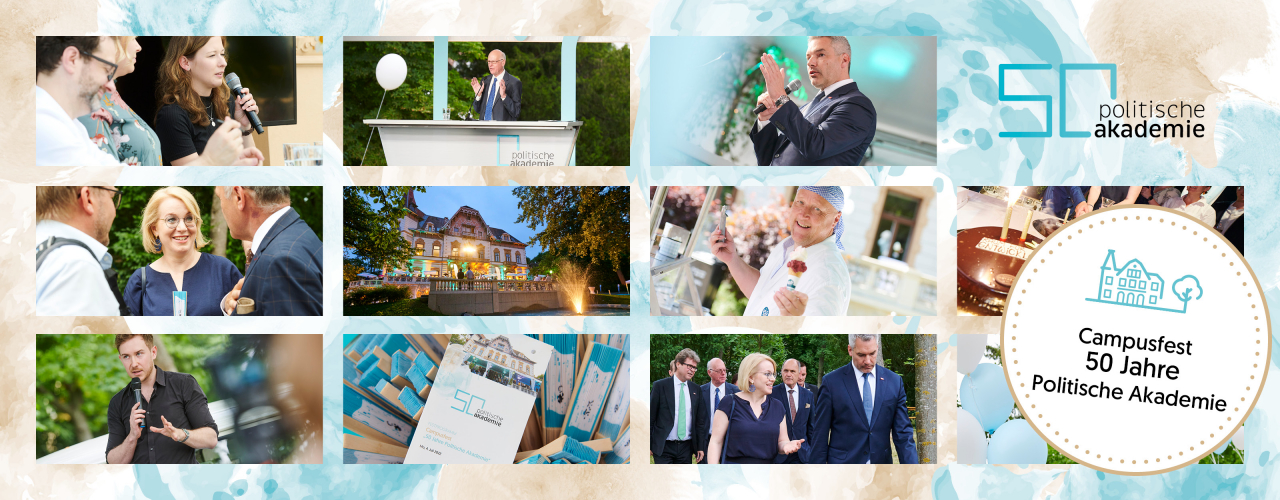Der Campus der Politischen Akademie ist seit 50 Jahren ein Kraftort für die Volkspartei, für ihre Funktionärinnen und Funktionäre, für Freundinnen und Freunde. Viele hatten hier in den letzten 50 Jahren ihren ersten Kontakt zu Politik und Volkspartei, haben hier ihre ersten Schulungen absolviert, ihre ersten Diskussionen geführt. Beim Campusfest am 4. Juli 2022 sind sie alle „heimgekommen“, um sich in 18 unterschiedlichen Veranstaltungen – Workshops, Diskussion und Vernetzungstreffen – auszutauschen und wiederzusehen. Gefeiert wurde am Abend im Festzelt gemeinsam mit Akademie-Präsidentin Bettina Rausch, Bundeskanzler Karl Nehammer, dem ehemaligen deutschen Bundestagspräsidenten Norbert Lammert und dem Verleger und Publizist Wolfram Weimer.