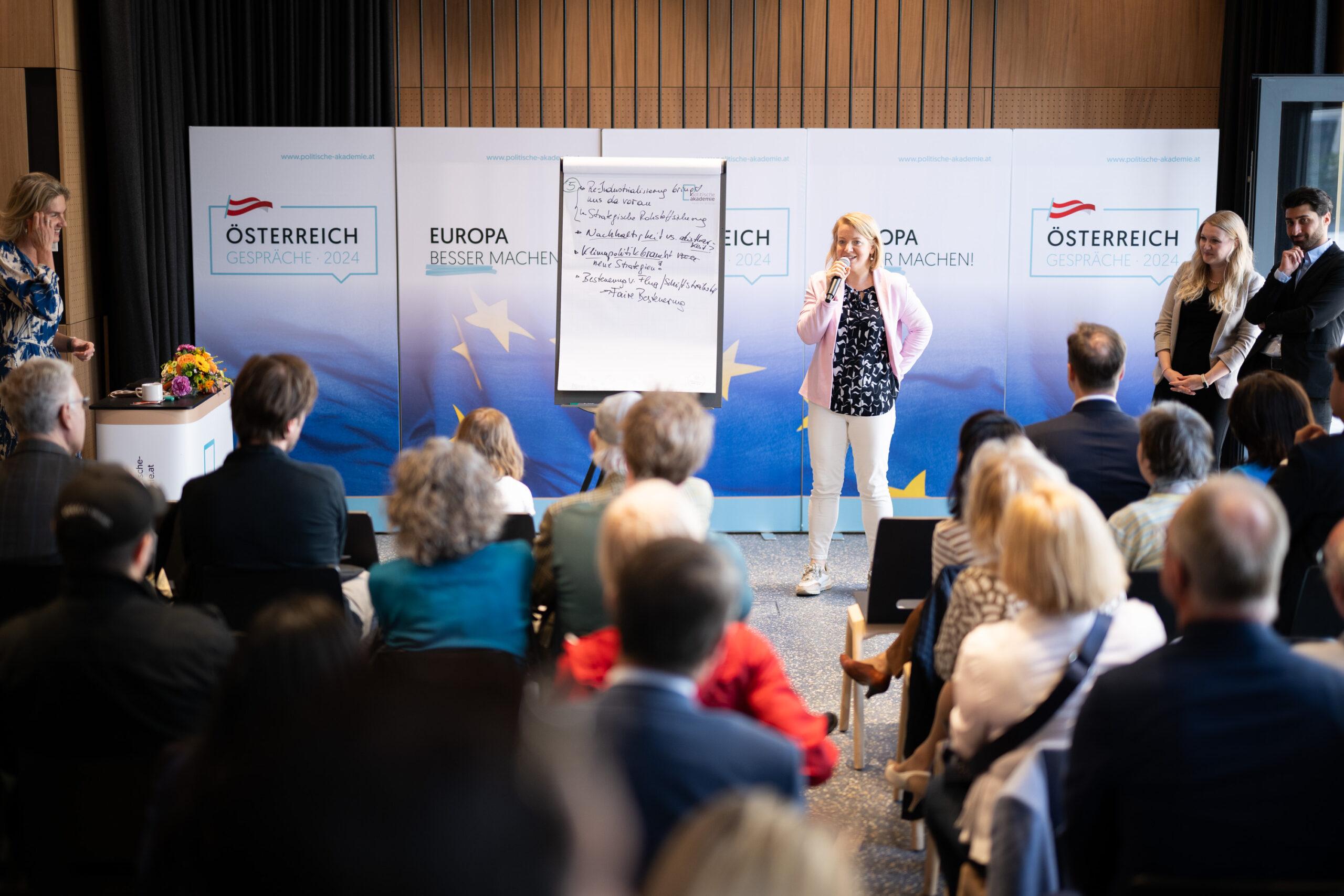 Die Tour der Österreich-Gespräche durch alle Bundesländer legte zur Halbzeit einen Zwischenstopp in Wien ein. Akademie-Präsidentin Bettina Rausch-Amon freuten sich über die vielen Interessierten, die an diesem Samstag-Vormittag in die Eventlocation “The Space” am Mozartplatz gefunden haben. Wie bei jedem Österreich-Gespräch war der erste Teil der Veranstaltung voll von interessanten Impulsen. Zu Wort kamen die Landesspitzenkandidatin zur Europawahl Kasia Greco genau so wie Nationalratsabgeordneter Rudolf Taschner und in einer moderierten Gesprächsrunde die ehemalige Außenministerin und österreichische Diplomatin Ursula Plassnik gemeinsam mit Reinhold Lopatka. Mit den vielen Eindrücken und Impulsen aus dem ersten Teil der Veranstaltung starteten die Teilnehmerinnen und Teilnehmer im zweiten Teil mit der Ideen-Arbeit. In Kleingruppen wurde an konkreten Ideen gearbeitet, um Europa besser zu machen.