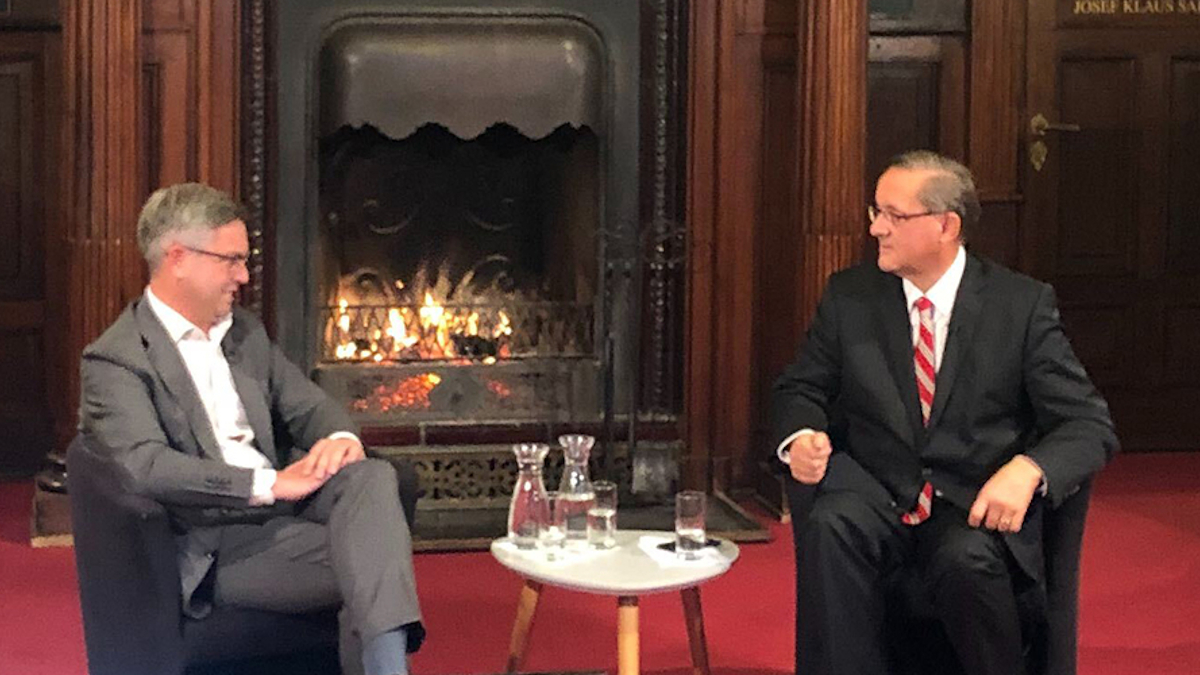 Dank drei Kameras und entsprechender Regie ist es möglich, die eindrucksvolle und doch vertraute Atmosphäre der Alois Mock Aula mit den Zuseherinnen und Zusehern zu Hause zumindest digital zu teilen. Vor dem Kamin nehmen an diesem Abend Staatssekretär Magnus Brunner und sein erster Gesprächspartner Günther Ofner, Vorstand der Flughafen Wien AG, Platz. Fernab der Schlagzeilen der Tagespolitik reicht das Gespräch von politisch Grundsätzlichem über die Zusammenarbeit mit dem Grünen Koalitionspartner bis hin zum Privatmensch Magnus Brunner aus Vorarlberg.