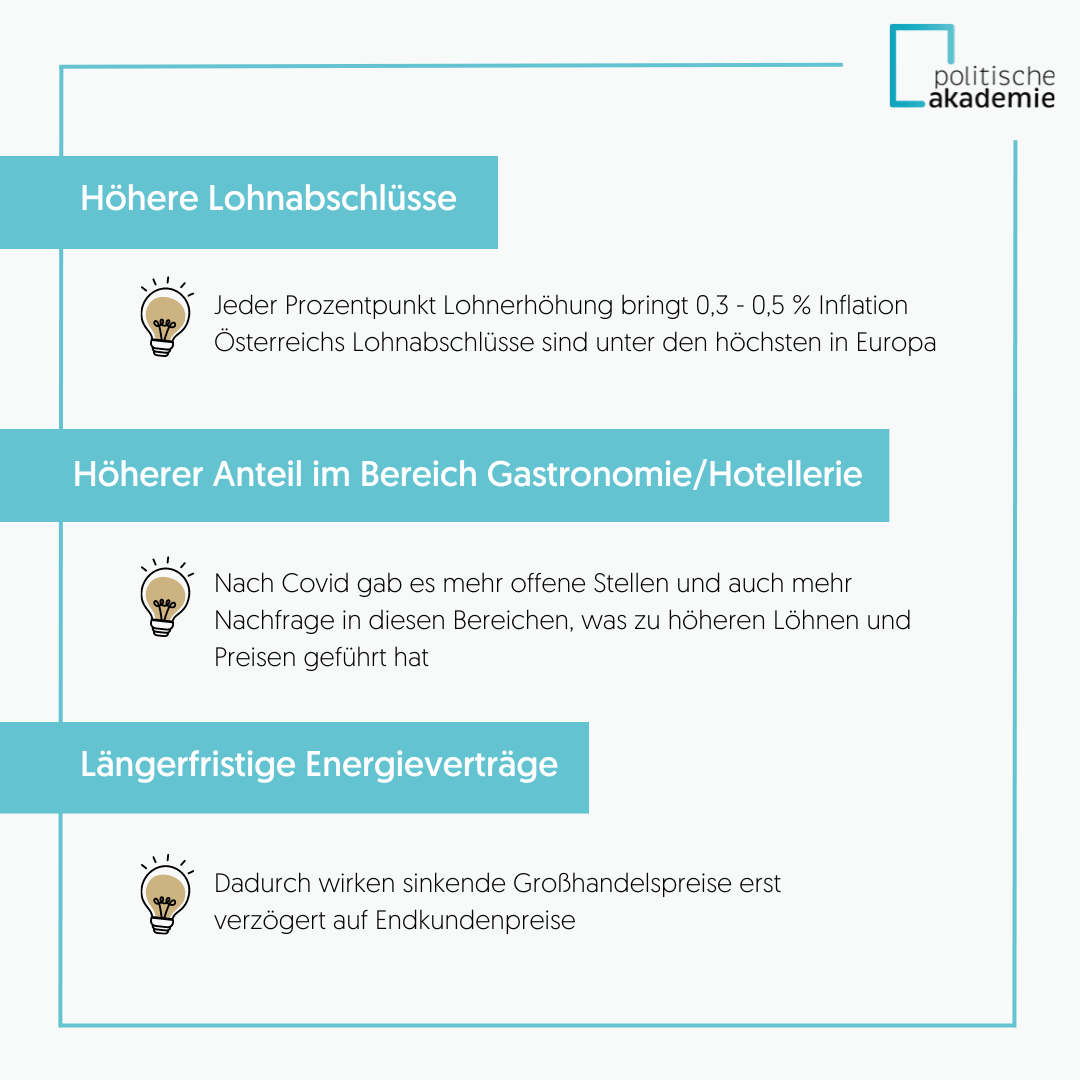 Was die negativen Konsequenzen von Inflation seien, führte Ralf Kronberger, Ökonom und Abteilungsleiter an der Wirtschaftskammer in der zweiten Vorlesung aus. So löse Inflation ein Verteilungsspiel aus: Wer ist schneller darin, die Preise zu erhöhen? Sind es die Unternehmen oder die Arbeitnehmer? Egal wer, es hätte zur Konsequenz, dass andere mit den Preisen nachziehen. Eine weitere Konsequenz sei, dass durch die Inflation auch die Wettbewerbsfähigkeit leidet. Österreichische Unternehmen, die höhere Löhne zahlen müssen, hätten einen Nachteil in der Exportwirtschaft, insbesondere gegenüber Unternehmen in Ländern, in denen nicht so hohe Löhne ausgezahlt werden. Das schwäche die heimische Wirtschaft.